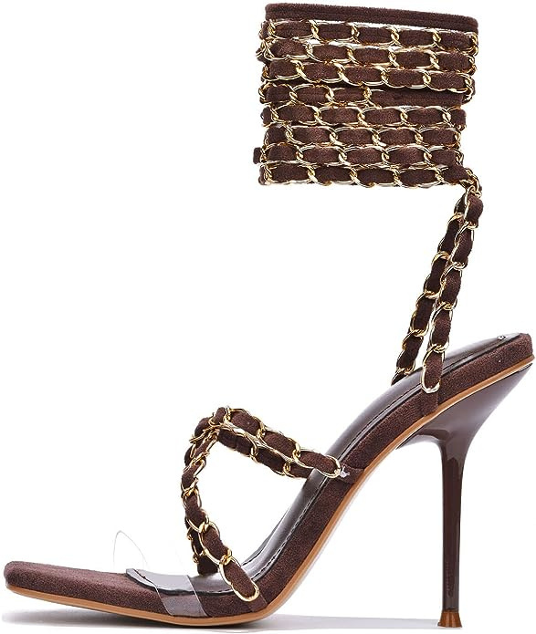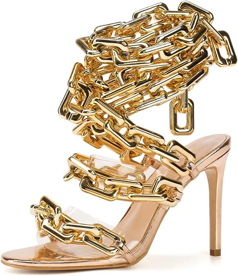 Frankie Hsu Luxury Women's Ankle Leg Lace Up Gold Link Chain Clear PVC Strappy Stiletto Round Toe High Heeled Sandals